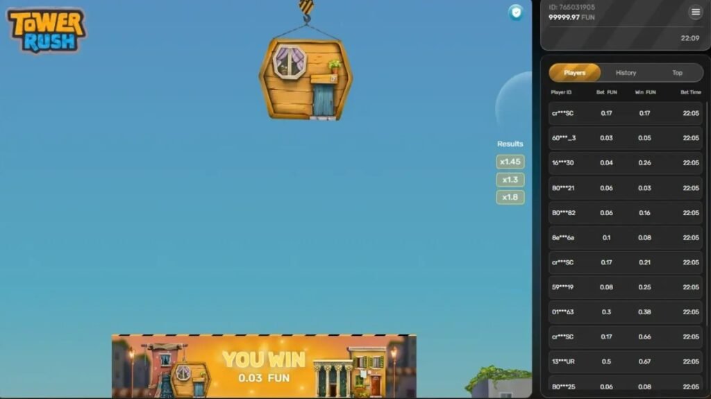Tower Rush ist ein dynamisches Casino-Minispiel, bei dem du Etage für Etage einen Turm errichtest, deinen Multiplikator erhöhst und im richtigen Moment auszahlst, bevor alles einstürzt.
